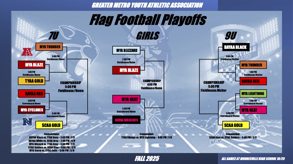 Mooresville Youth Athletics is a non-profit organization focused on the development of every child, in an safe environment. The success of the individual children is our top priority, as we strive to ensure that each child meets his or her goals. With MYA, your child will have the opportunity to participate in a competitive, yet nurturing environment. Every child will have a fun and fulfilling experience when they are part of the MYA family.